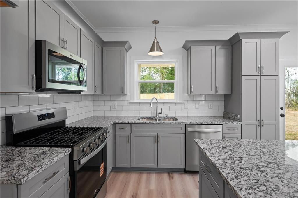 NEW CONSTRUCTION- Welcome to 6738 Barneswood Drive in the Woodside Subdivision! This beautiful GOLD FORTIFIED custom-built Prime Design home features the ValuCraft Transitional Collection. Perfectly situated on a .25-acre lot, this thoughtfully designed one-story floor plan offers 1,354 square feet of comfortable living space with 3 bedrooms and 2 full bathrooms. As you step onto the covered front porch and enter through the foyer, you're immediately welcomed by the homes bright, open layout. Straight ahead, the spacious living room flows seamlessly into the dining area and open-concept kitchen. The kitchen features an island, granite countertops, all-wood custom cabinetry, a 3x6 white subway tile backsplash, stainless steel Whirlpool appliances, a gas oven, and a stainless Delta faucet. The dining area is highlighted by a stylish brushed nickel chandelier, adding a subtle touch of elegance. Tucked privately down the hallway off the kitchen, the main suite offers a relaxing retreat. The en-suite bath showcases 12x24 sleek tile flooring, double vanities, stainless plumbing fixtures, brushed nickel lighting, and a generous walk-in closet. Just off the living room, you'll find two additional bedrooms and a full bathroom, providing comfort and privacy for family or guests. A separate laundry room with built-in shelving adds both convenience and extra storage.Throughout the home, gorgeous Hickory luxury vinyl plank flooring enhances the main living areas and hallways, while tile flooring adds a clean, modern finish to the bathrooms and laundry room. Plush carpet ensures comfort in all bedrooms. This home also features a tankless water heater, offering energy efficiency and endless hot water. Step outside to enjoy the covered back porch and large, sodded yard perfect for relaxing or entertaining. Seller will contribute up to $5,000 toward buyer's closing costs, prepaids, or upgrades when using the preferred lender.