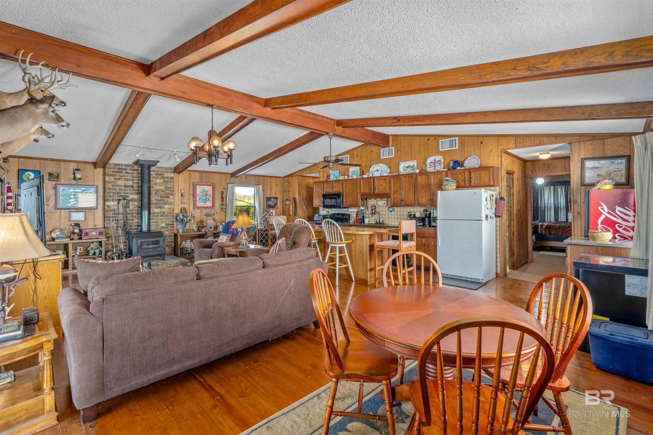 This furnished property offers a unique opportunity to enjoy direct waterfront living on the stunning Tensaw River. With over 50 feet of water frontage, the home features a spacious open kitchen and den that provide picturesque views of the expansive patio and the river beyond. Perfect for fishing enthusiasts, the property includes a wood-burning stove, your private boat ramp, a shared boat ramp, and your own private dock equipped with electricity and water. Below the main level, there's plenty of shaded space ideal for entertaining, relaxing, or storing boats and vehicles. Additionally, the home boasts a nearly new roof, air conditioning, dock, and seawall, making it a perfect blend of comfort and functionality for waterfront living. --Easy to show----Interior photos coming the week of July 20, 2025-- Buyer to verify all information during due diligence.